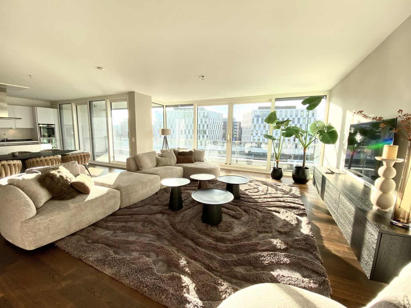 Moderne 4-Zimmer-Wohnung in Top-Lage mit Fußbodenheizung und bodentiefen Fenstern, großzügiger Sonnenloggia, Einbauküche, verglastem Panoramaaufzug und privater Tiefgarage.