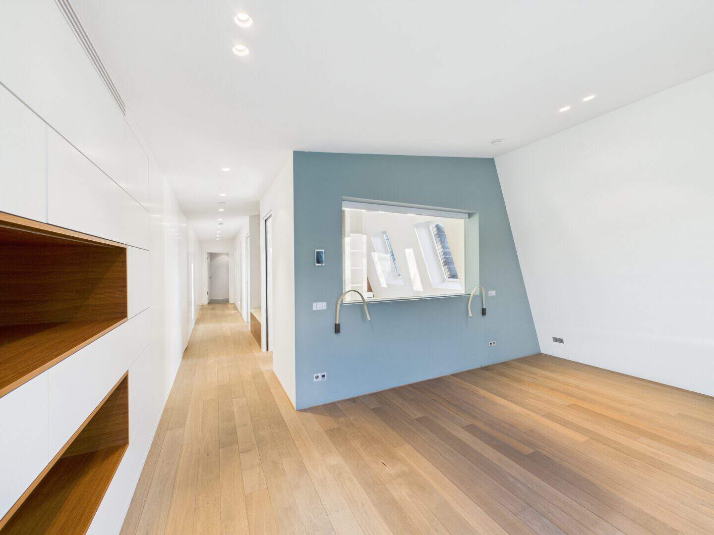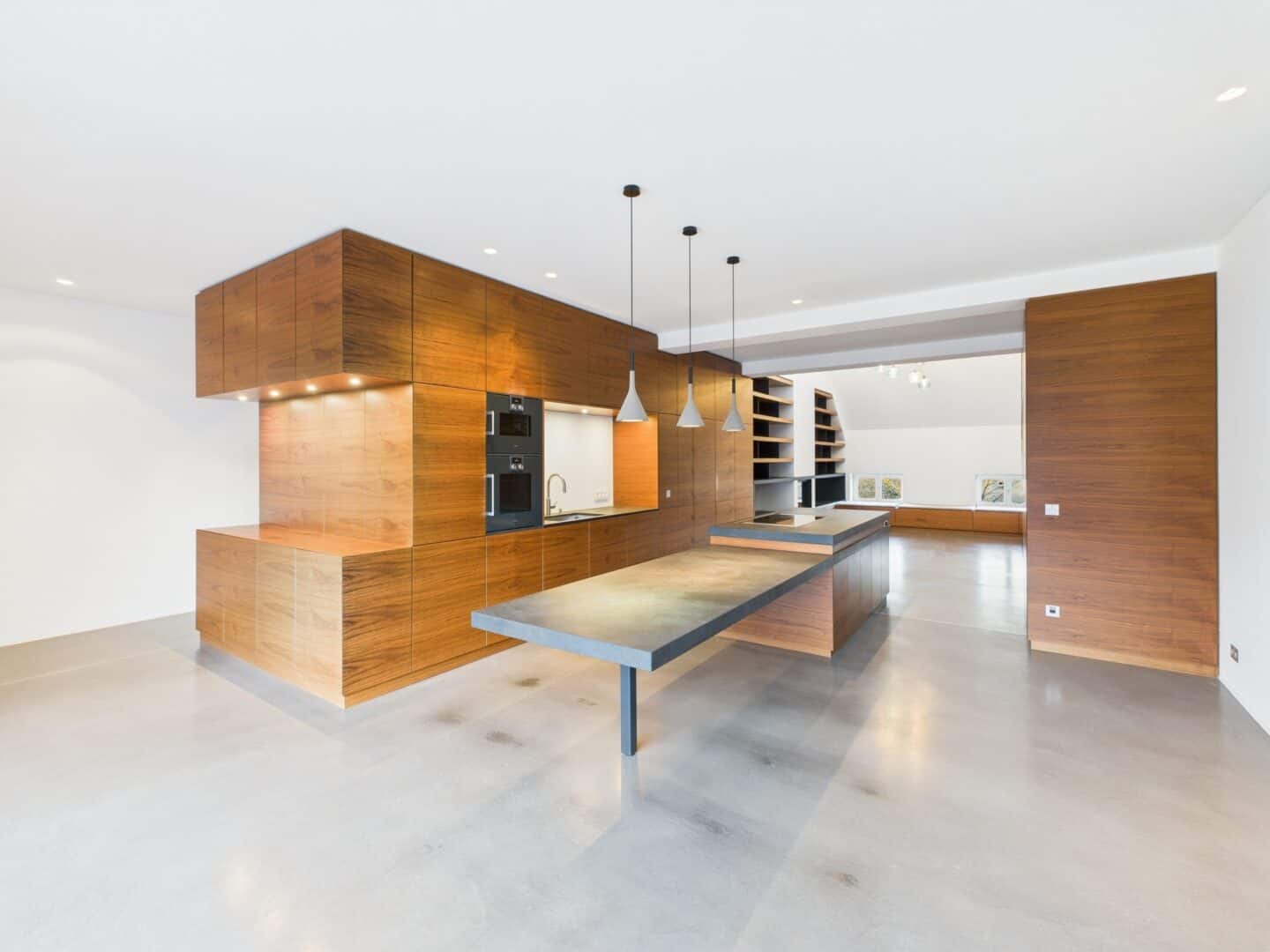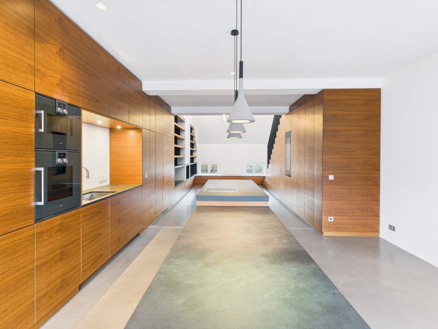 Die offene Gestaltung der Räumlichkeiten mit ihren hohen Decken schafft ein lichtdurchflutetes und weitläufiges Ambiente. Über das integrierte BUS-System (Gira KNX) lassen sich Beleuchtung, Multimediaausstattung (Unterputzlautsprecher, Basalte Musikserver), Heizung und Sonnenschutz steuern.