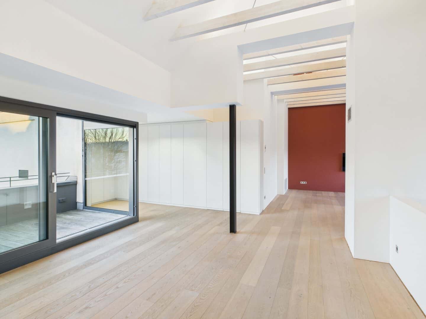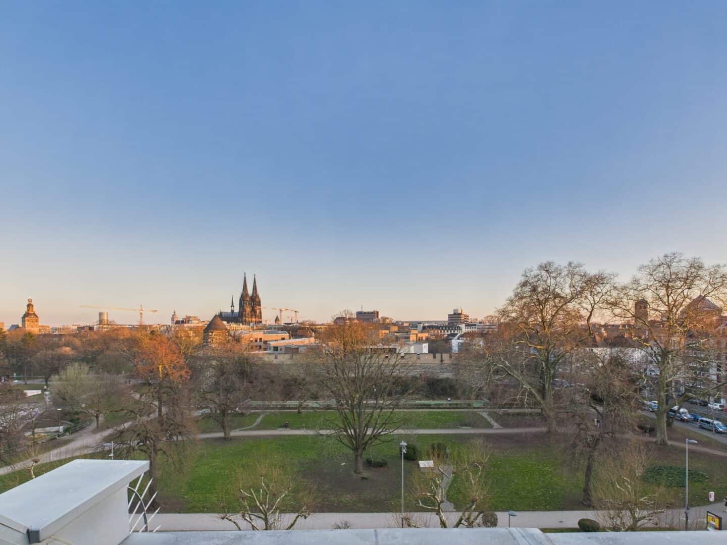 Das großzügige und helle Wohnzimmer befindet sich auf der oberen Etage - von dort aus hat man einen traumhaften Ausblick auf den Kölner Dom und Zugang zur Dachterrasse.