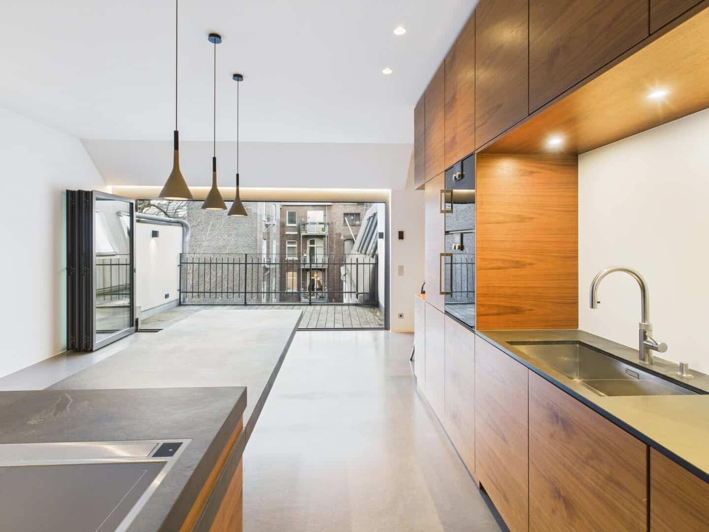 Die untere Etage (4. OG) verfügt über eine hochwertige Einbauküche mit festverbautem Schiefer-Esstisch, Gaggenau-Geräten, einem Quooker Wasserhahn, Weinkühlschrank, kleiner Bar und einer unauffällig in die Einbauschränke integrierten Vorratskammer. Von der Küche aus, mit eigenem Balkon, ist der Übergang zur Bibliothek fließend. Des Weiteren beherbergt die untere Etage drei großzügige Schlafzimmer, davon hat eines direkten Zugang zur Dachterrasse mit Sonnensegel (Nord-West-Ausrichtung). Ebenfalls auf dieser Etage vorhanden sind drei luxuriöse Badezimmer, zwei davon en Suite, und mit ebenerdigen Duschen sowie Armaturen von Dornbracht ausgestattet. Im Masterbad mit Wanne, Regendusche und Sauna lässt es sich wunderbar entspannen.