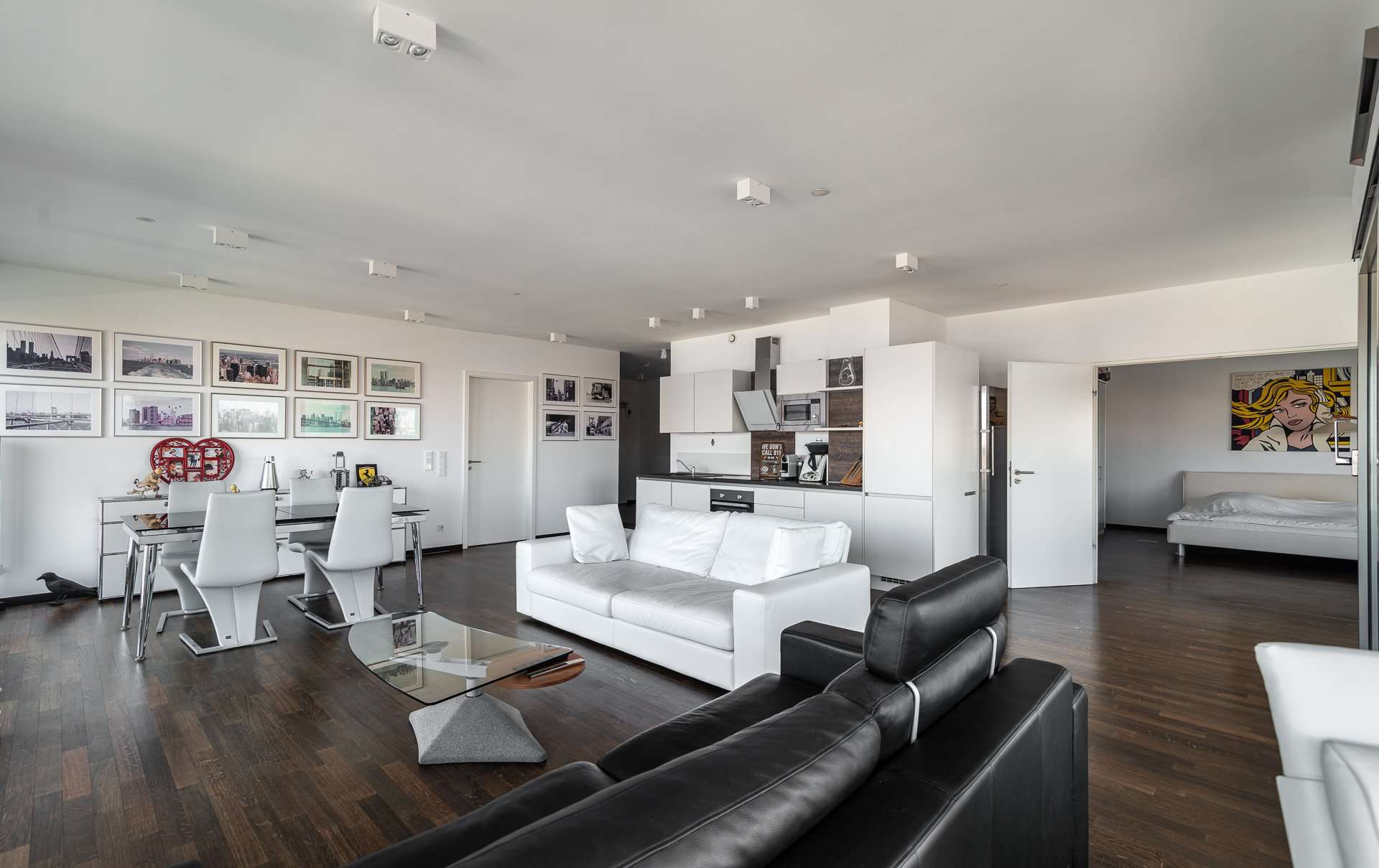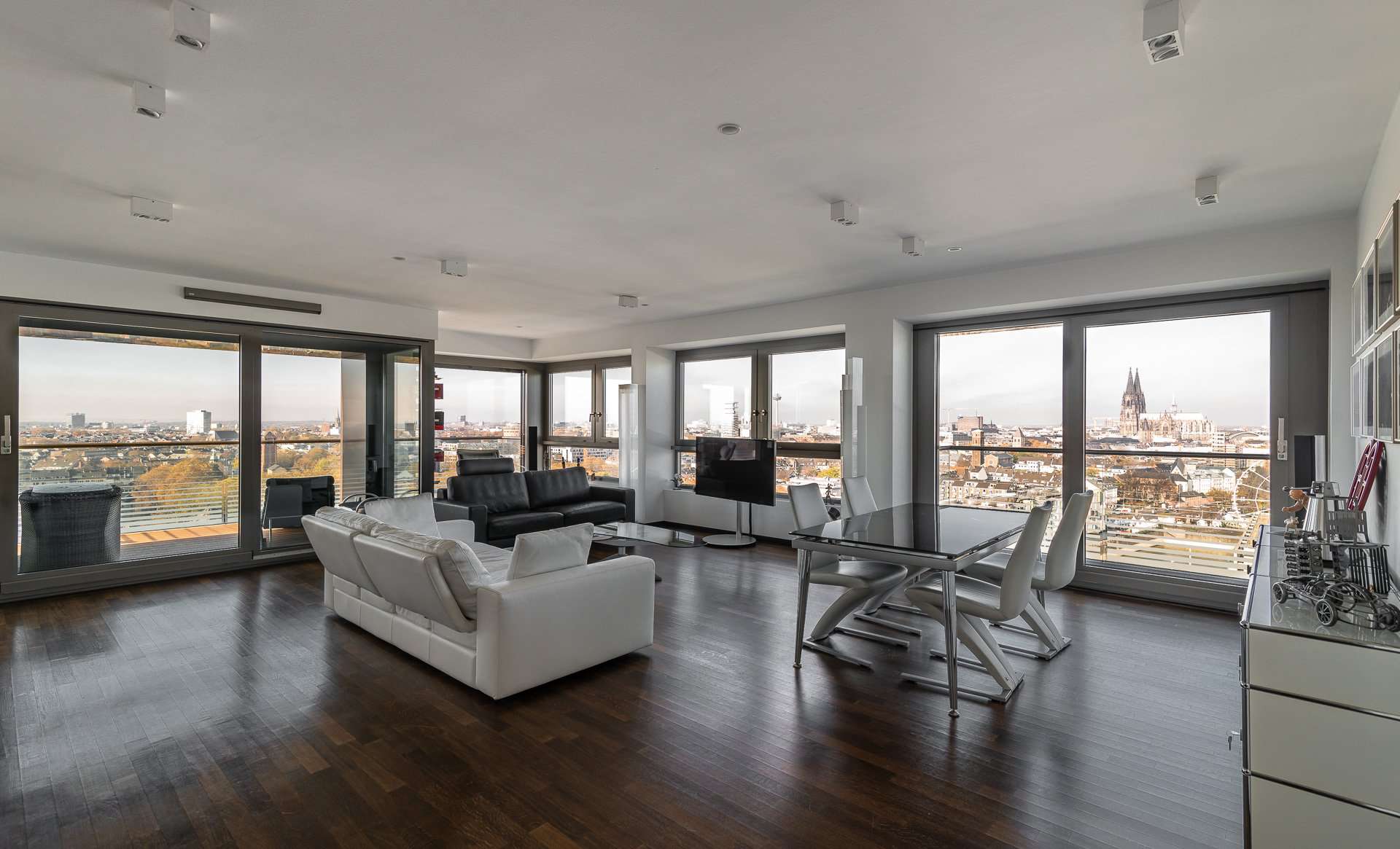 Die 3-Zimmer-Wohnung auf der 15. Etage des Kranhauses bietet luxuriöses Wohnen an einem der angesagtesten Orte Kölns.