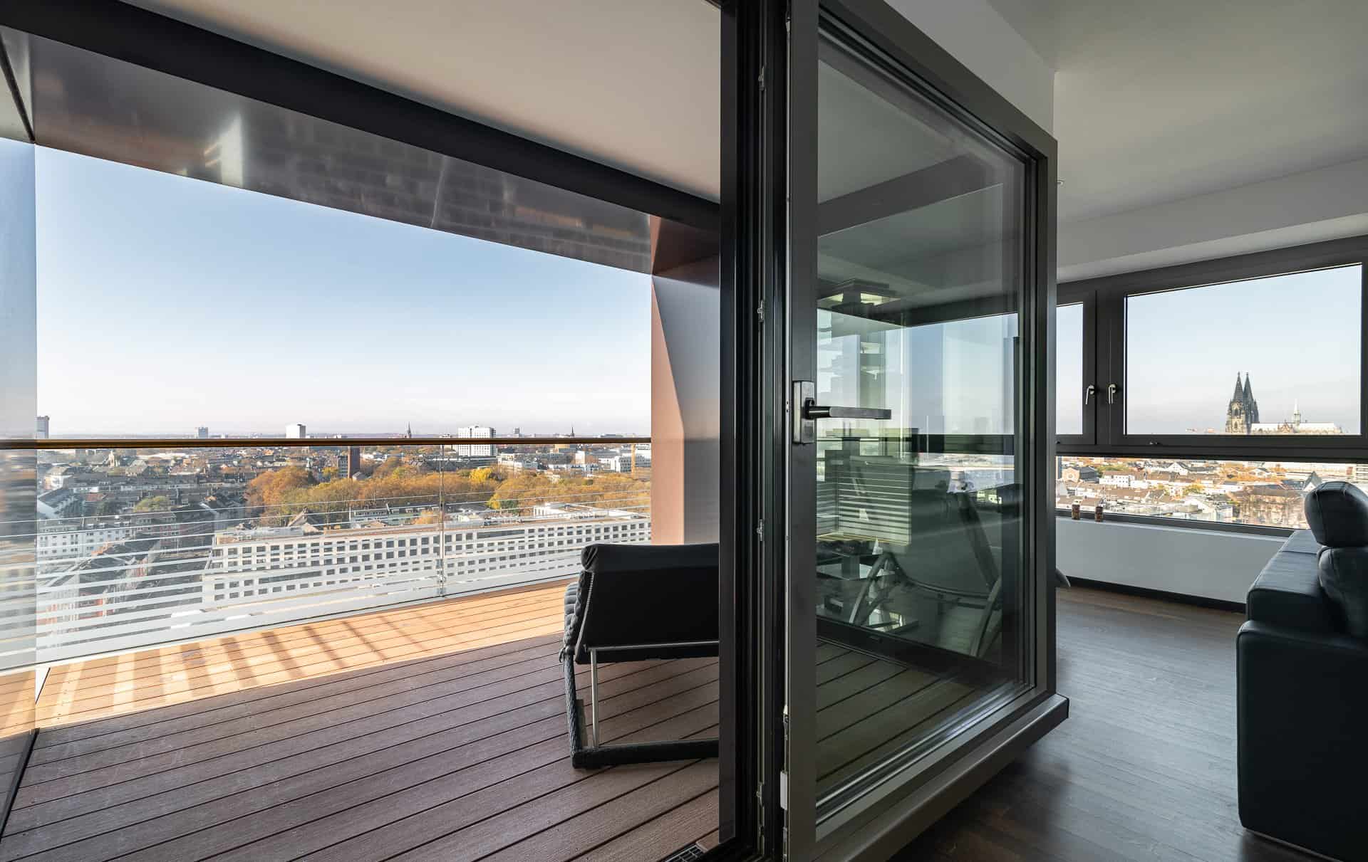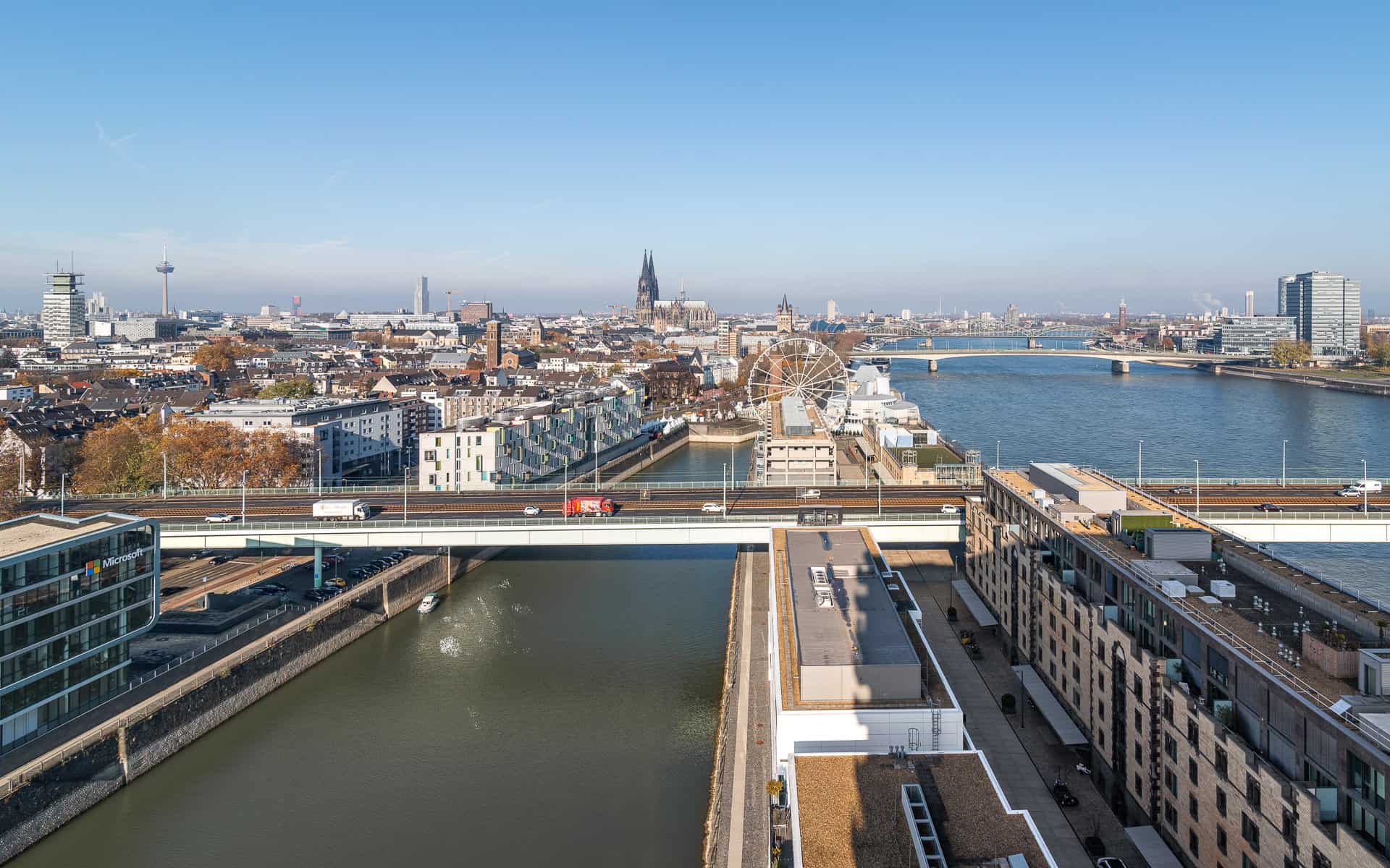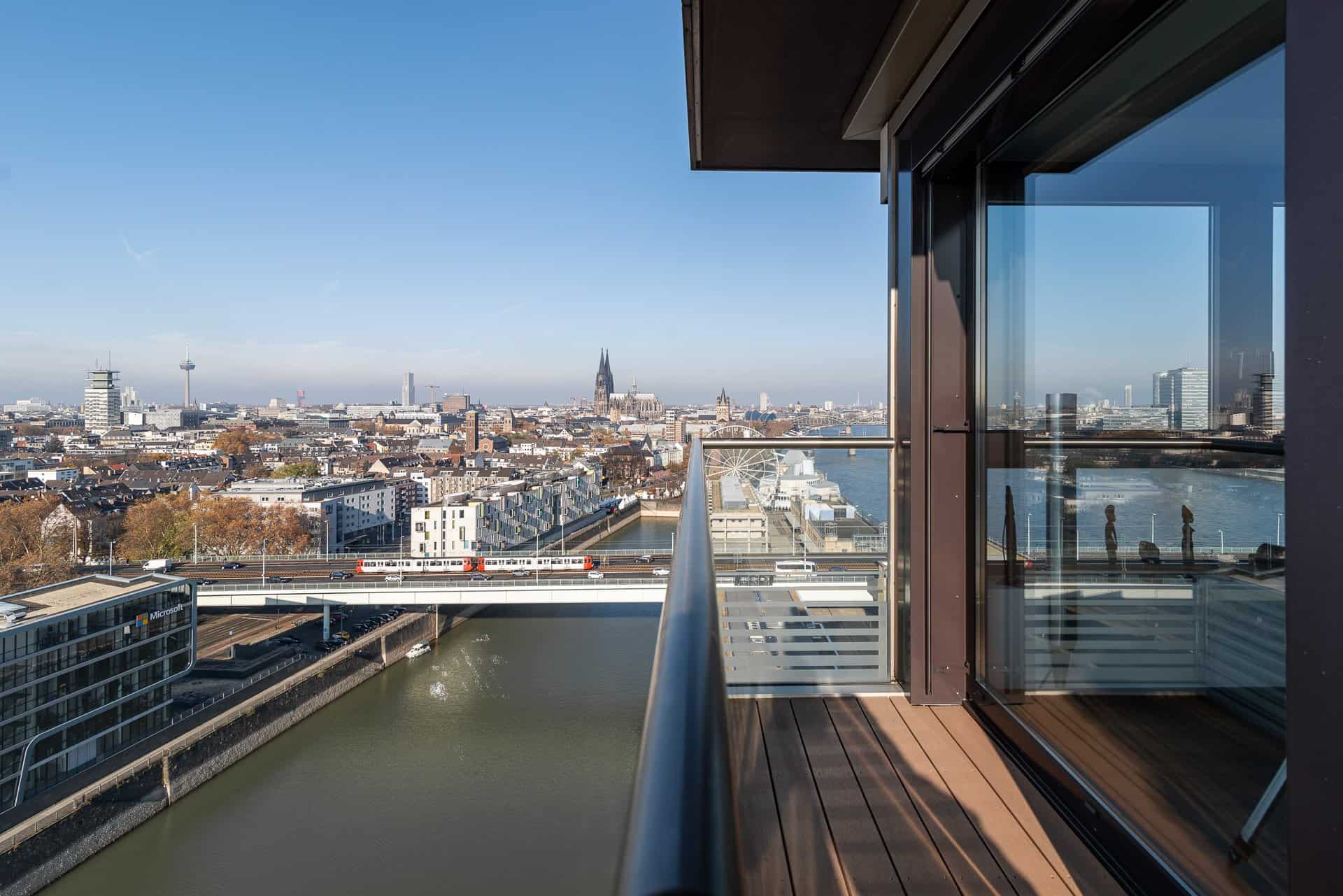 Die unmittelbare Nähe zur Innenstadt sowie der Blick auf den Rhein, den Yachthafen sowie den Dom bieten Wohnen auf allerhöchstem Niveau.